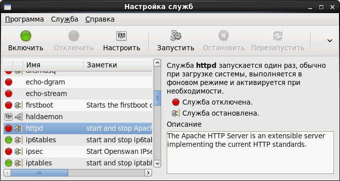 Включите сервис httpd, выполнив команду главного меню Система > Администратор > Службы. В открывшемся окне в списке служб выберите httpd и нажмите кнопку «Включить»: