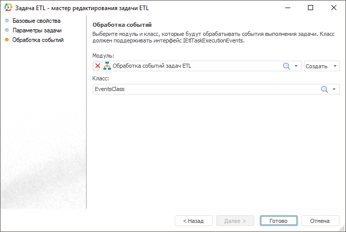 В раскрывающемся списке «Модуль» выберите объект среды разработки, а в списке «Класс» выберите класс, содержащий реализацию обработчиков событий задачи ETL. Список классов-обработчиков содержит все классы, унаследованные от класса EtlTaskExecutionEvents.