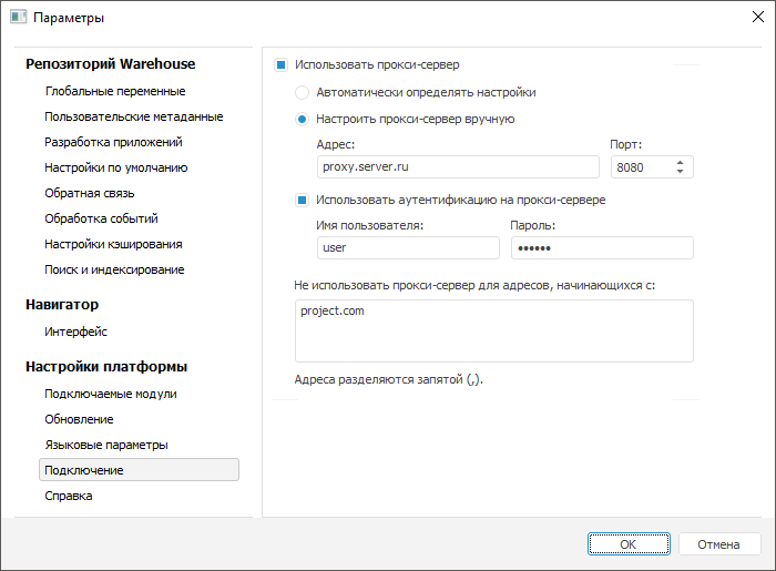 Если доступ из текущей локальной сети в Internet осуществляется через прокси-сервер, то его настройки можно задать в параметрах репозитория. Для задания настроек прокси-сервера используйте вкладку «Подключение» в диалоге «Параметры».