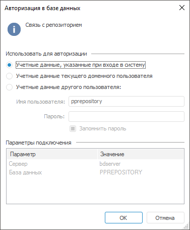 Параметры. В таблице отображаются параметры схемы, которой принадлежит база данных (Сервер, База данных). Если диалог открыт для ввода учётных данных пользователя, обладающего правами администрирования пользователей, то в списке будет присутствовать параметр: