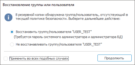 выберите вариант «Восстановить» и нажмите кнопку «Продолжить». Для восстановления пользователя/группы будет запрошен пароль системного администратора и администратора сервера БД;