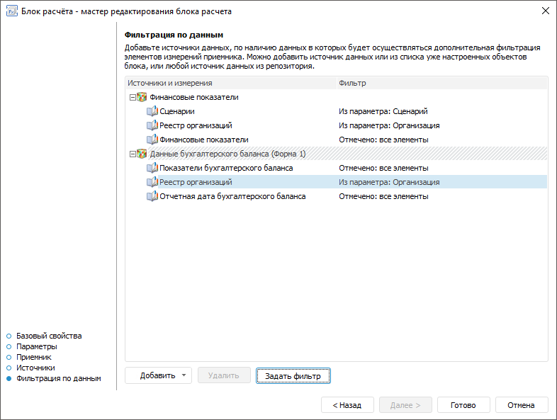Настройка фильтрации по данным выполняется на странице «Фильтрация по данным» в мастере редактирования блока расчёта: