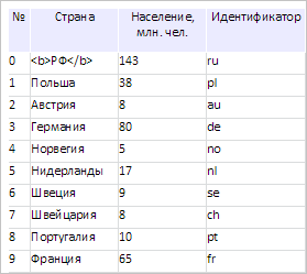 Щелкнем по столбцу с наименованием «Страна». В результате этого действия строки таблицы были отсортированы по значению строк в столбце «Страна» с учетом HTML-тегов: