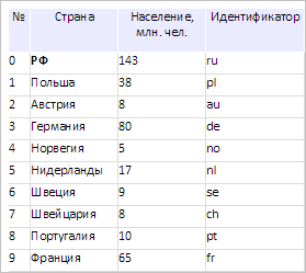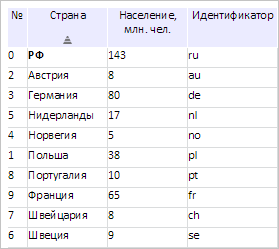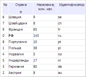 Повторно щелкнем по столбцу с наименованием «Страна». В результате этого действия строки таблицы были отсортированы по убыванию с помощью значений строк в столбце «Страна» без учета HTML-тегов: