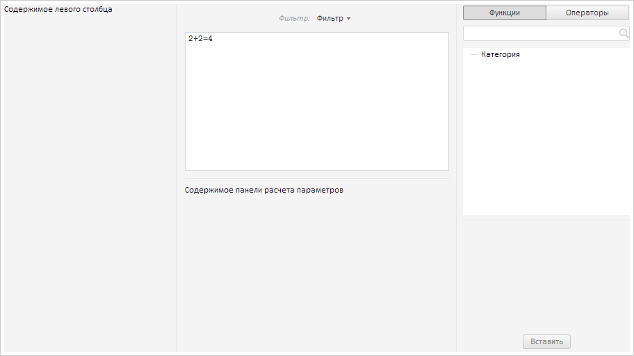 | CalculationPanelContent | Свойство CalculationPanelContent определяет содержимое панели расчета параметров редактора выражения. | |