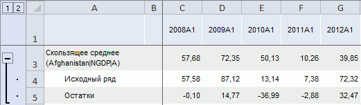 После применения метода в таблицу данных для каждого выделенного ряда будет добавлен ряд с наименованием вида «Скользящее среднее(<Имя_Ряда>)», содержащий результаты расчета. Например: