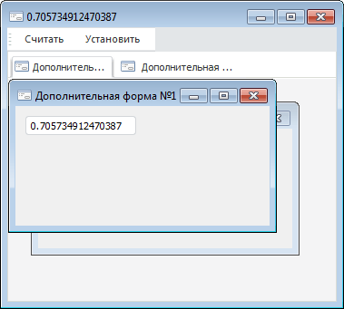 После выполнения примера при нажатии кнопок панели инструментов главной MDI-формы, будет осуществляться проверка на возможность приведения активной дочерней MDI-формы к пользовательскому интерфейсу IUserInterface. Если преобразование возможно, то в зависимости от нажатой кнопки, будет считываться, либо устанавливаться значение свойства «UserProp», описанного в интерфейсе IUserInterface. При считывании значение будет выводиться в заголовок формы. В качестве устанавливаемого значения будет случайное вещественное число.