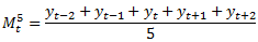 Обозначим через Mtp значение скользящего среднего в момент времени t, определенное по p точкам. Например: