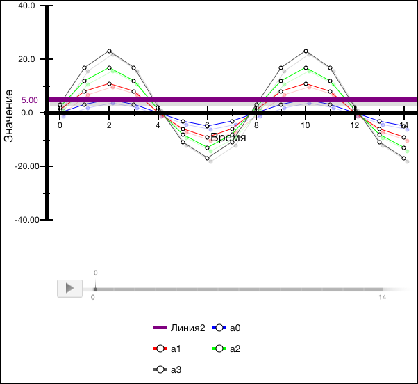 В данном примере реализовано создание и отображение линий уровня на диаграмме. В консоль среды разработки выводится следующая информация о первой линии уровня: