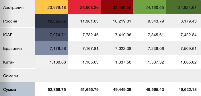 В результате выполнения примера для первой строки и первого столбца таблицы экспресс-отчёта было применено условное форматирование. Для раскраски ячеек строки использовалась палитра, состоящая из жёлтого цвета и оттенков зелёного и красного цветов, для ячеек столбца - палитра из цветов серых оттенков: