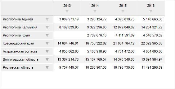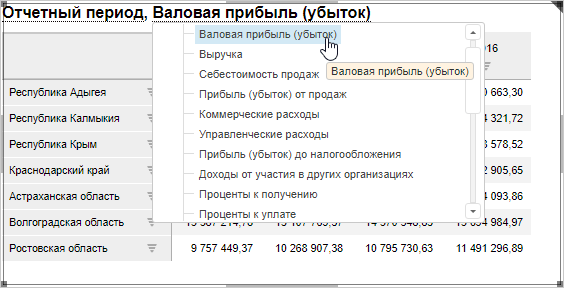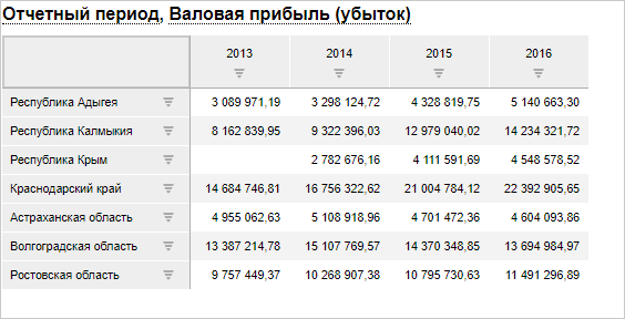 После выполненных настроек в заголовок будут выведены наименования требуемых измерений, подчёркнутые пунктирной линией. Например: