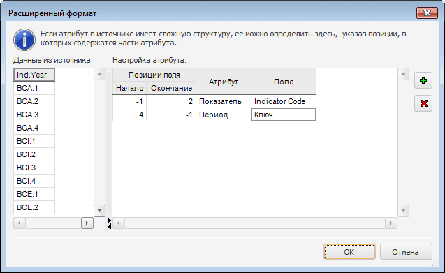Настройка формата атрибутов выполняется с помощью диалога «Расширенный формат» и определяет параметры разбора составного атрибута, использованного в источнике данных.
