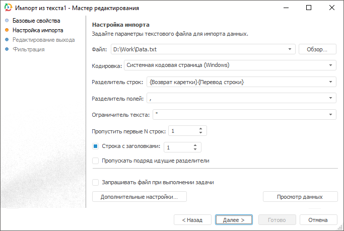 Если установить флажок «Запрашивать файл при выполнении задачи», то при выполнении задачи ETL будет открыт диалог для выбора текстового файла. По умолчанию флажок снят, при этом работа осуществляется с тем файлом, который указан в поле «Файл».