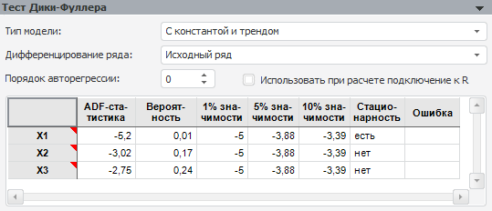 Тест Дики-Фуллера является средством проверки стационарности временного ряда. Результаты расчеты данного теста для каждой исследуемой переменной отображаются на соответствующей панели: