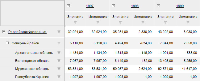 В таблице будут отображены исходные данные (факт Значение), расчётные значения (факт Изменение), а также будет произведена агрегация данных с уровня областей на уровень федеральных округов и уровень страны.