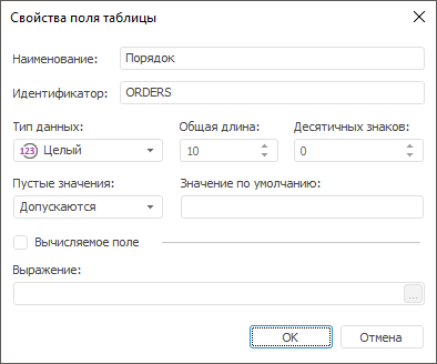 На странице «Поля таблицы» добавьте поля. Для это нажмите кнопку «Добавить». На экране появится редактор свойств поля: