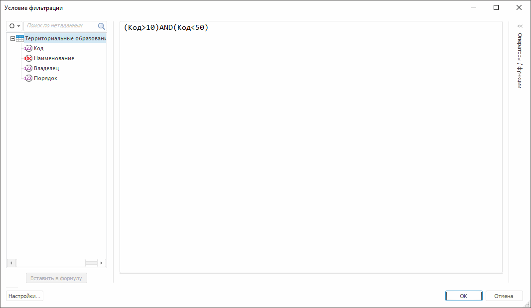 В указанном примере сформировано выражение «(Код>10) And (Код<50)».