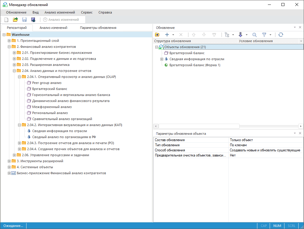 Для синхронизации объектов между репозиториями и их обновления используйте инструмент «Менеджер обновлений»: