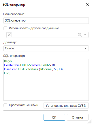 Примечание. Для драйверов Oracle недопустимо отдельное использование разделителя «;». Использование данного разделителя допустимо только внутри «Begin...end;».