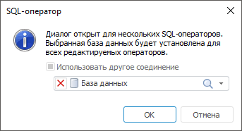Следует выбрать базу данных из объектов репозитория. Выбранная база данных будет установлена для всех редактируемых SQL-операторов.
