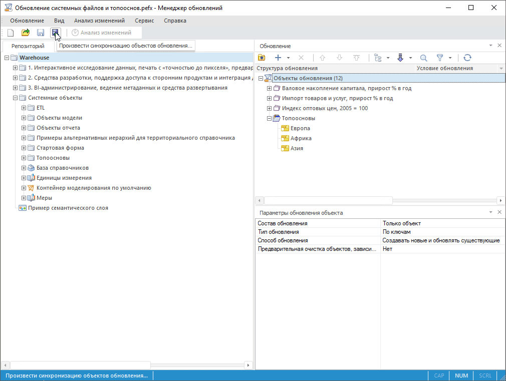 Примечание. При открытии готового обновления отображение объектов на панели «Обновление» для пользователя будет зависеть от процесса обновления при использовании разделения ролей администраторов и разных методов разграничения доступа.