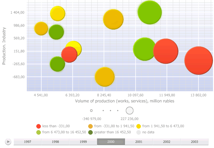 A bubble chart is a scatter chart where data points are replaced with bubbles and its color and sizes serve as additional data dimensions. A bubble chart does not have the category axis. The horizontal and vertical axes are value axes. In addition, a bubble chart contains an animated timeline, which displays the frequency of values.