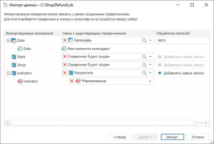 Поля автоматически будут разбиты по измерениям, значения текстовых полей будут импортированы как значения атрибута «Наименование» элементов измерения. Все поля, имеющие вещественный тип данных, импортируются как значения. Для каждого поля со значением будет создан факт в измерении фактов.