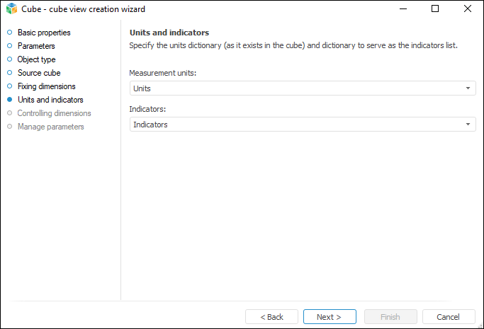 Select the dictionary in the drop-down lists that contain all existing cube dictionaries.These dictionaries should have a specific structure. The structure is described in the Units and Indicators section. If the structure of the selected indicators or units dictionary does not satisfy the required conditions, a warning message is displayed.