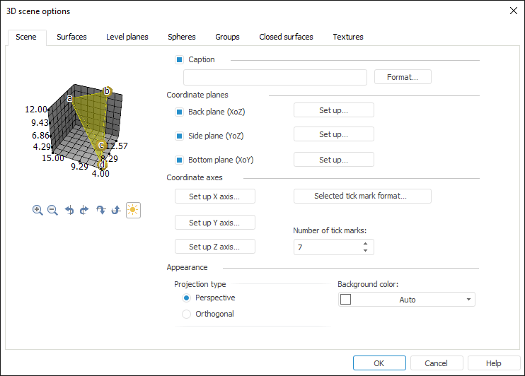When the checkboxes that contain plane names are selected, all coordinate planes are shown in 3D scene. By default the checkboxes are selected.