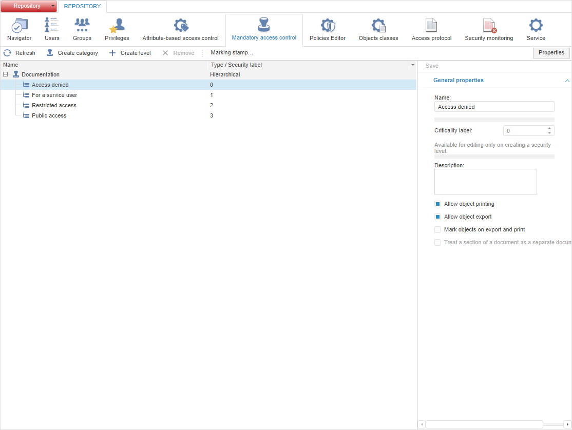 The section is based on the mandatory access control method and is used to generate a list of security categories and levels that will be used to separate permissions.