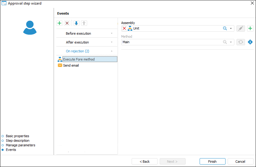 On Rejection. The list of actions will be started on the current step rejection. The list is available for steps with manual execution. If the step is executed automatically, the tab is not displayed.