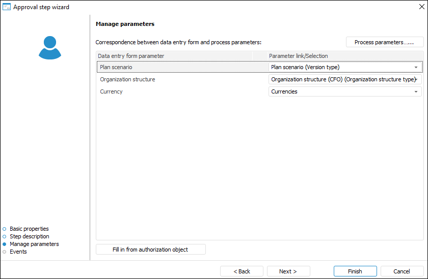 To automatically copy parameter settings from authorization objects, click the Fill from Authorization Object button.