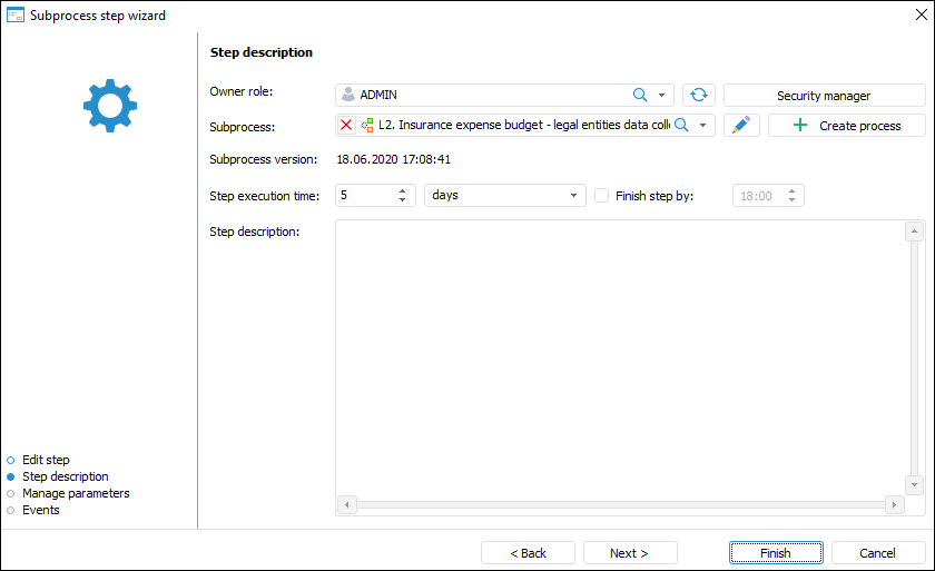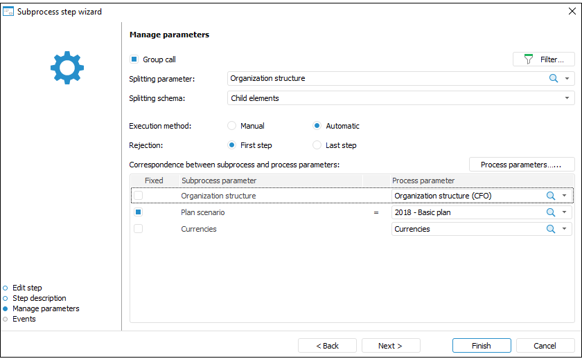 To create a step for starting one or several nested subprocesses with specific parameters, open the subprocess step wizard.