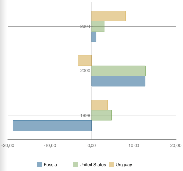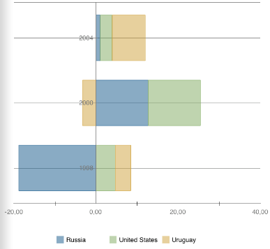The value of each element is displayed as a horizontal bar, which length is proportional to the element value. A custom set of bars is displayed for each of the data groups; data series are highlighted by the bar color.