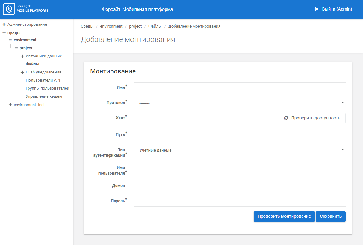 To work with local storage and set up connection to folder at file server, use the Files subsection in the selected project: