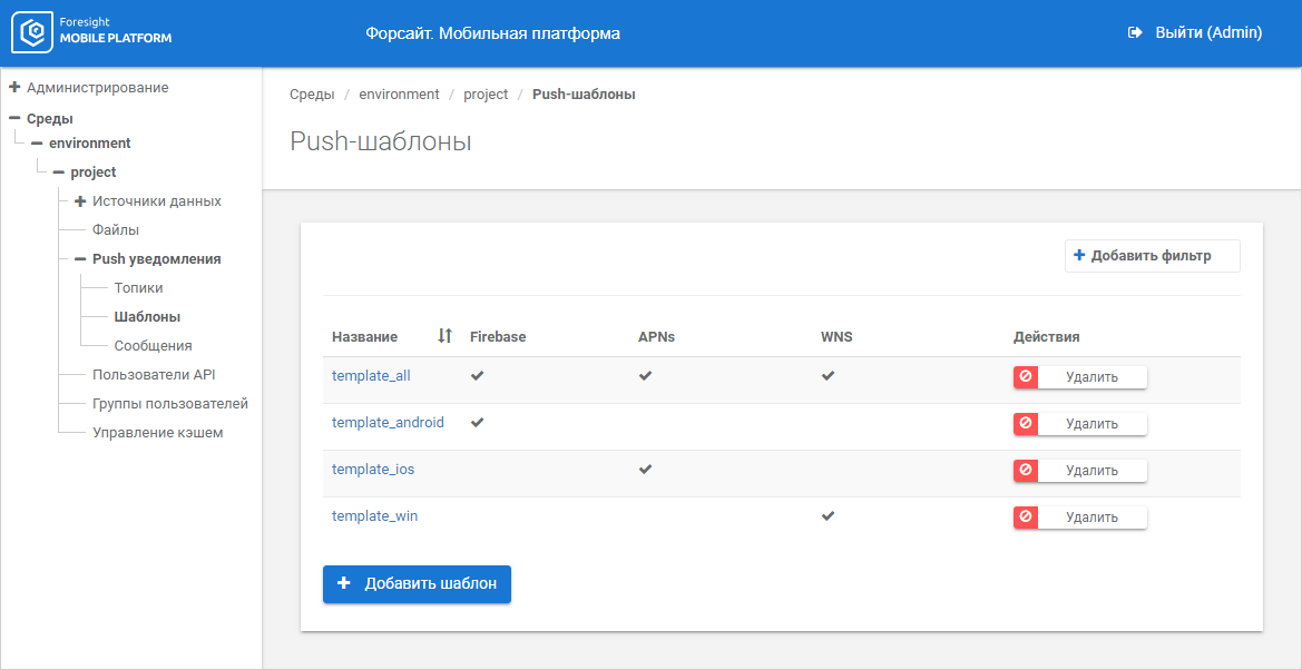 The working area displays the list of push notification templates within the project.