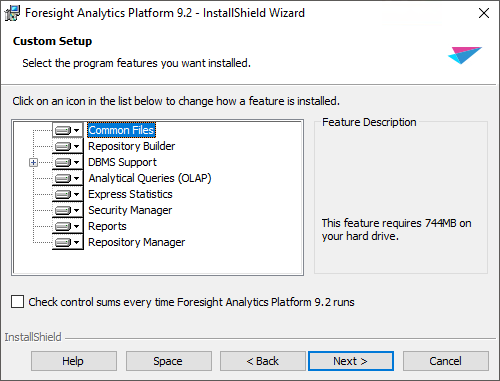 The Check Control Sums Every Time Platform Runs checkbox determines whether integrity check of Foresight Analytics Platform is executed. If the checkbox is selected, at each Foresight Analytics Platform startup the integrity of executable files is checked, and file contents is compared with a standard. The checkbox is deselected by default, and integrity check of Foresight Analytics Platform is not executed. The option value is applied only for the installed release.