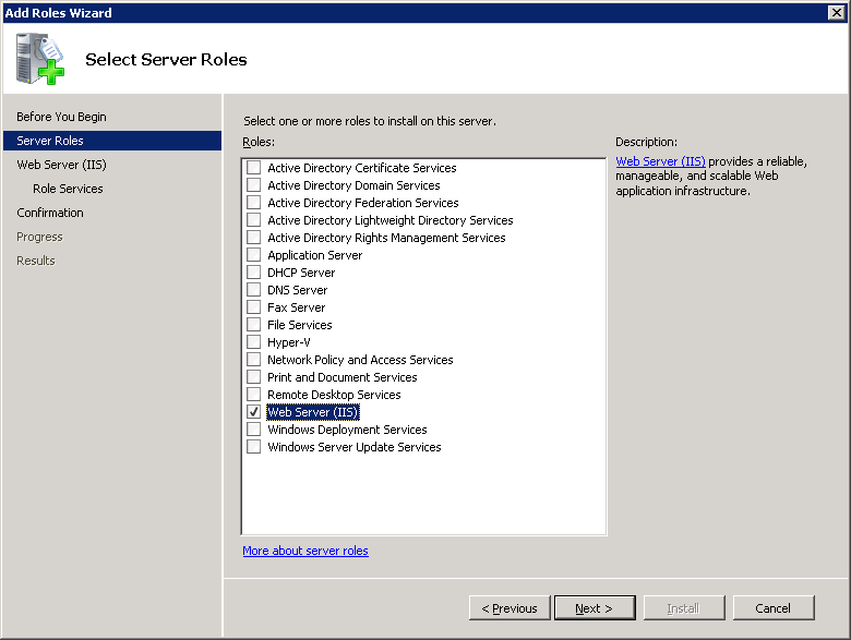 1. In the server manager go to the Roles sections, and in the Roles Summary group click the Add Roles hyperlink; in the wizard that opens go to the Server Roles page and select the Web Server (IIS) checkbox.
