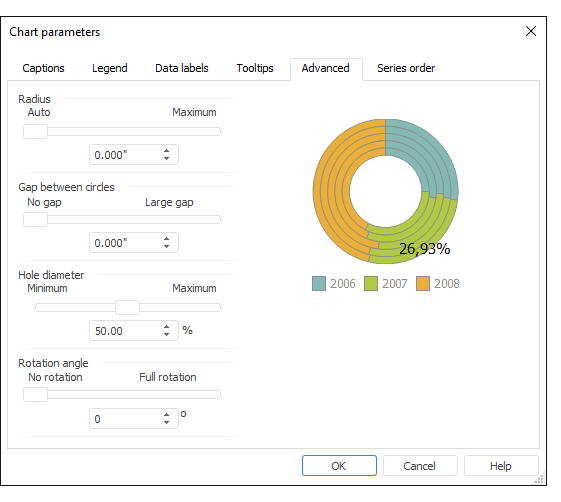 To set up additional parameters of mixed, pie, doughnut, waterfall charts, histogram, histogram with fluctuation intervals and bubble chart, go to the Advanced tab of the Chart Parameters dialog box.