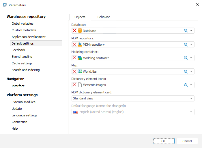 Default repository settings help to determine objects or object behavior which will be used in the Foresight Analytics Platform tools with no need to select it again. For example, a default map will be used in all reports.