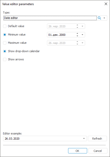 Show Drop-Down Calendar. If the checkbox is selected, the editor contains the drop-down calendar button allowing to select required date.