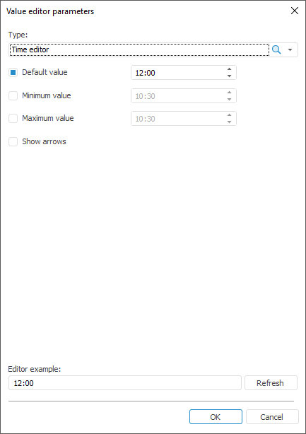 Default Value. Determines the time value that is displayed in the editor by default. This value must be in the range of available values determined for the editor. If the range of available values for editor is not set, the value must be in the range from 0:00 to 23:59.