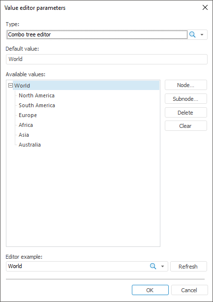 The combo tree editor shows the set of available values as a hierarchical list or as a tree.