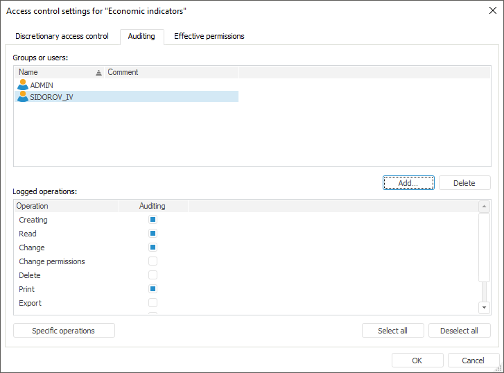 NOTE. Auditing setup for specific operations is available for the object types, for which specific operations are assumed. The list of specific operations differs for different types of objects.