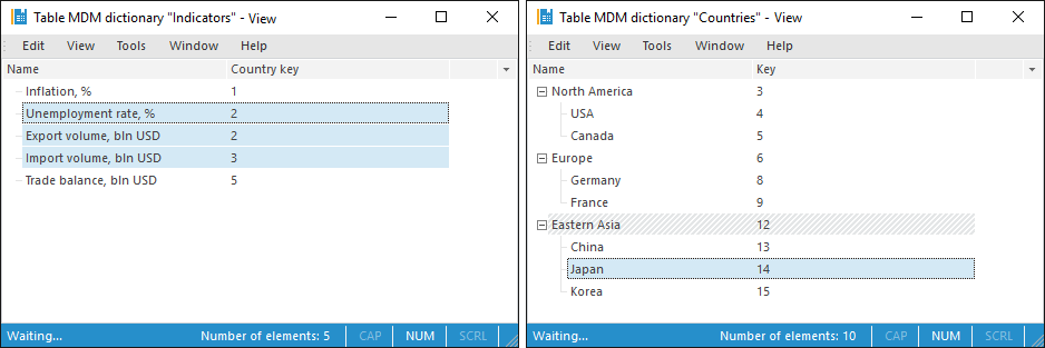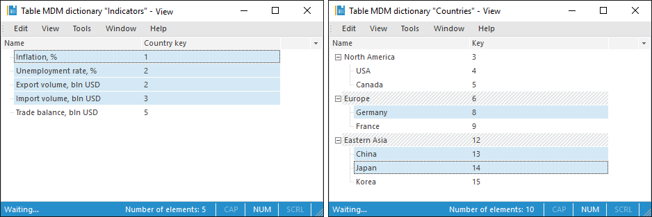 For example, the data consumer contains the Indicators dimension and the data source contains the Countries dimension. The dimensions contain the following data and the following selection: