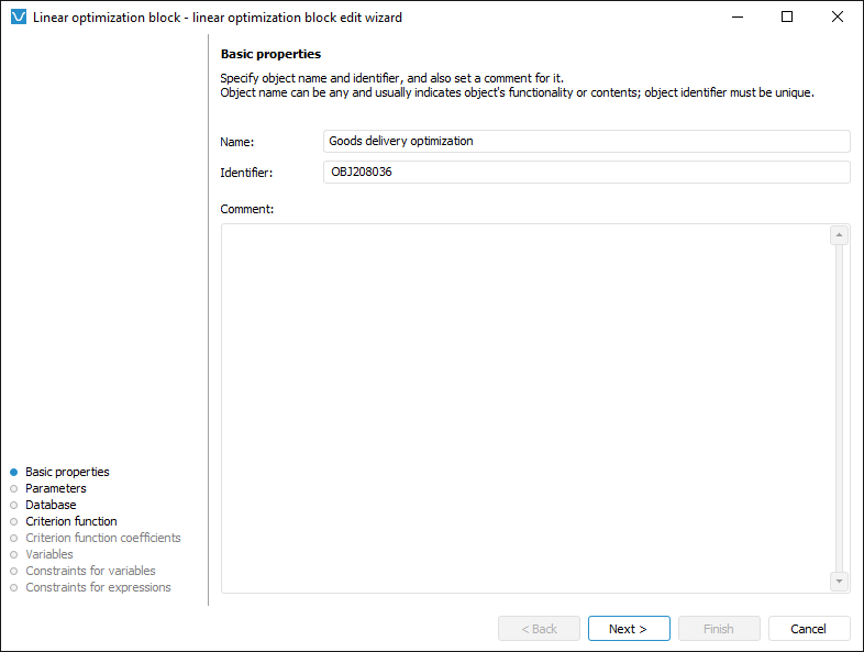 Basic properties of linear optimization block can be set up on the Basic Properties page in the linear optimization block editing wizard.
