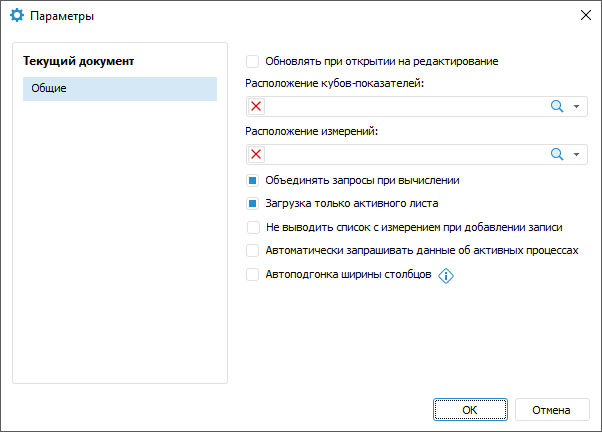 For each data entry form it is possible to set up folders containing indicators and dimensions that are used in data entry form and set parameters of automatic form refresh. If paths to folders of cube-indicators and dimensions were set, then on building a table area on the Table Area Structure tab hierarchy in dimension tree and indicators tree will be displayed by default to contents of the corresponding folder.