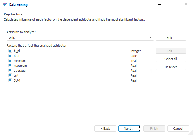 This type of analysis calculates a degree of influence of each factor on the dependent attribute and detects the most significant factors.