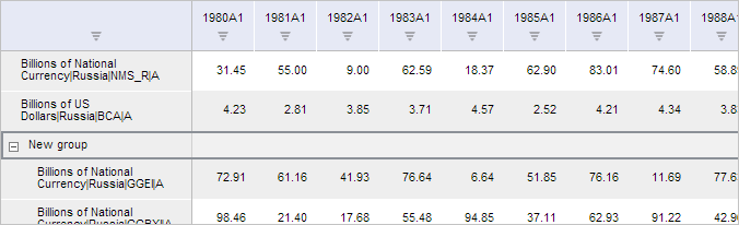 After executing the example selected time series are grouped. After a new group is expanded, the table will look as follows: