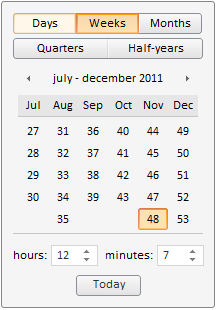 If the one value (Mode: 1) is set to the Mode property then the component is displayed in the week mode: